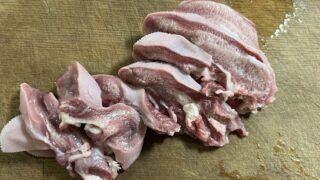 舌表面の汚れを洗い流す舌表面の汚れを水で洗い流します。このまま切って焼いて食べても美味しいですが、外側の皮が硬いので、より美味しく食べるために次の工程で取り除きます。外側の皮を取り除く鹿タンに熱湯をかけ、3分ほど待ちます。熱湯をかけることに...