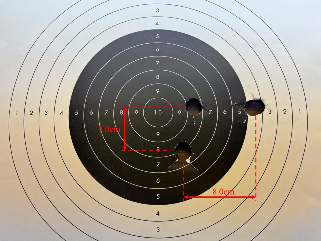 サボットスラッグ弾と比べてしまうと着弾点にバラツキがありますが、モノリットよりもだいぶマシな結果です。