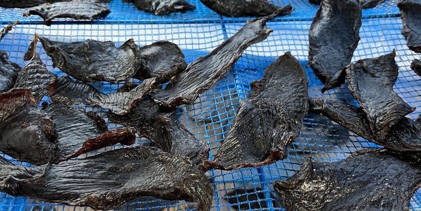 ここで、鹿肉が反り返るくらい乾かすと、パサパサのジャーキーになってしまうので、触ったら多少弾力があるくらいに乾いたら次の工程に進みます。