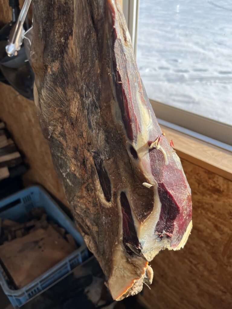 こちらが熟成開始から一年経過した鹿の生ハムです。